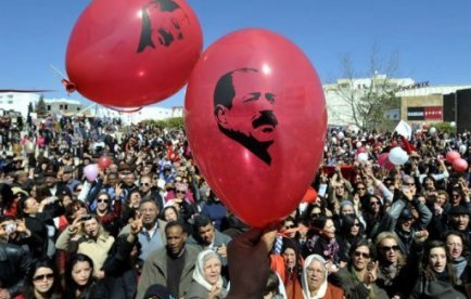 Des centaines de ballons rouges et blancs, les couleurs de la Tunisie, illustrés avec le visage de l’opposant anti-islamiste se sont élevés dans le ciel de Tunis en début d’après-midi, à quelques mètres de l’endroit où il a été abattu le 6 février à bout pourtant.